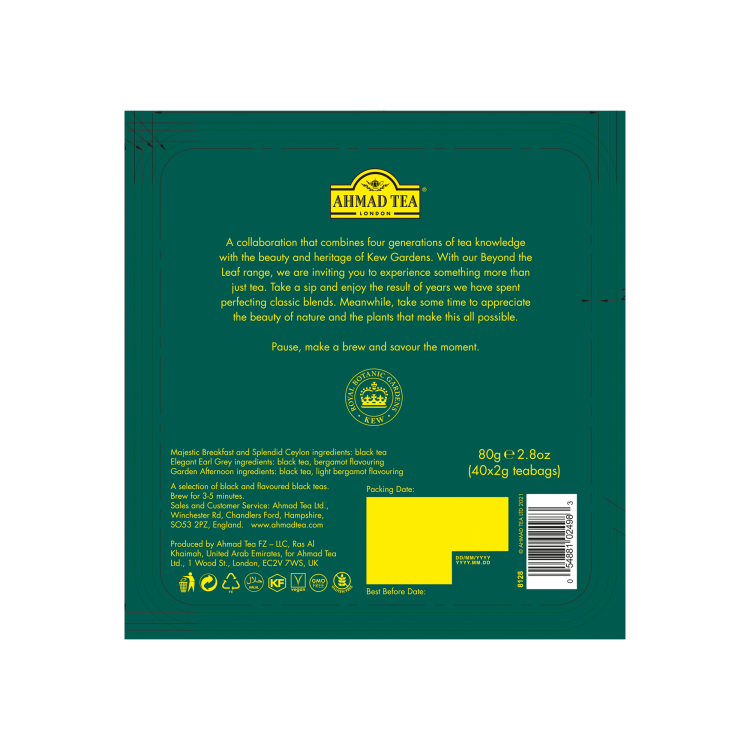 | Ingredient Declaration | Majestic Breakfast and Splendid Ceylon: Black teaTeaElegant Earl Grey: Black tea, bergamot flavouringGarden Afternoon: Black tea, light bergamot flavouring |