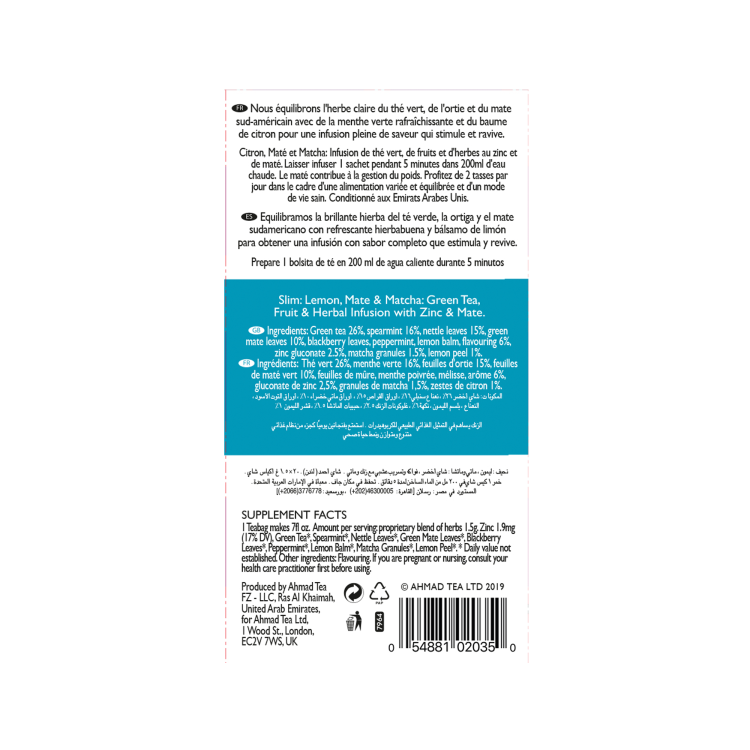 | Ingredient Declaration | Green Tea 26%Spearmint 16%nettle leaves 15%Green mate leaves 10%Blackberry leavesPeppermint, lemon balmFlavouring 6%Zinc Gluconate 2.5%Matcha Granules 1.5%lemon peel 1% |