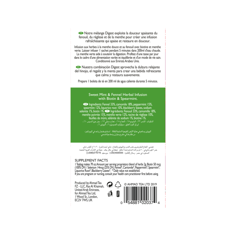 | Ingredient Declaration | Fennel 33%Camomile 18%Peppermint 15%Spearmint 12%liquorice root 10%Blackberry leavesSodium selenite 1%Biotin 1% |