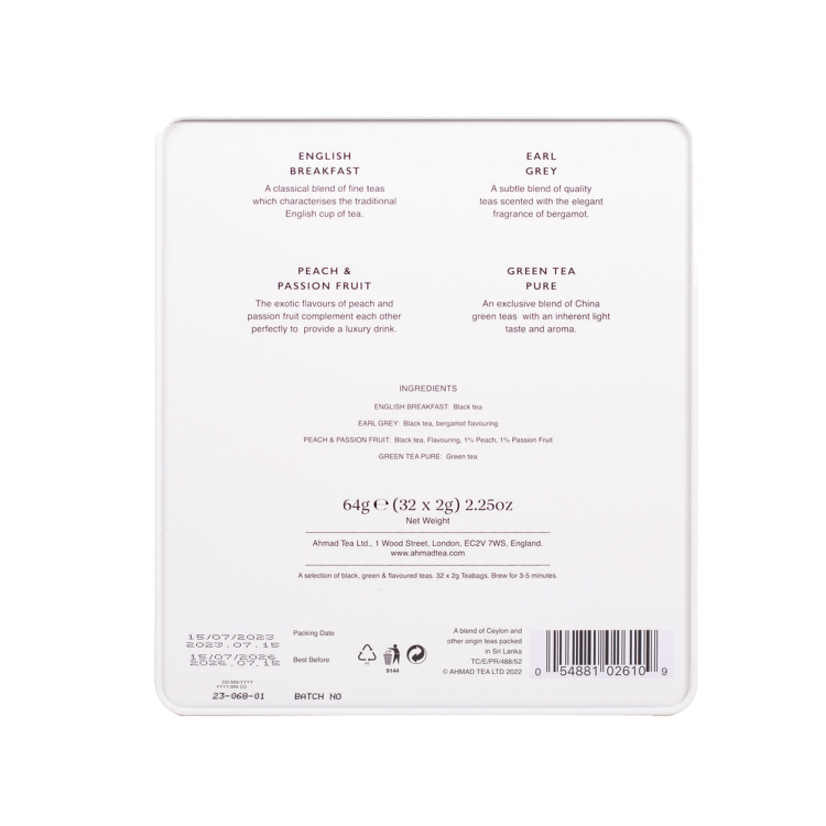 | Ingredient Declaration | Black TeaBlack Tea, Bergamot FlavouringGreen Tea, Black Tea - 2% Peach & Passion fruit |