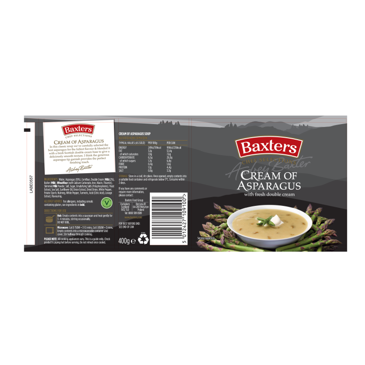 | Ingredient Declaration | Water, Asparagus (10%), Cornflour, Double Cream (Milk) (2%), Butter (Milk), Wheatflour (with Calcium Carbonate, Iron, Niacin, Thiamin), Skimmed Milk Powder, Salt, Sugar, Emulsifying Salts (Polyphosphates), Yeast Extract, Sea Salt, Sunflower Oil, Onion Extract, Dried Onion, White Pepper, Potato Starch, Nutmeg, White Pepper, Turmeric, Acid (Citric Acid), Lovage Extract, Flavouring. |