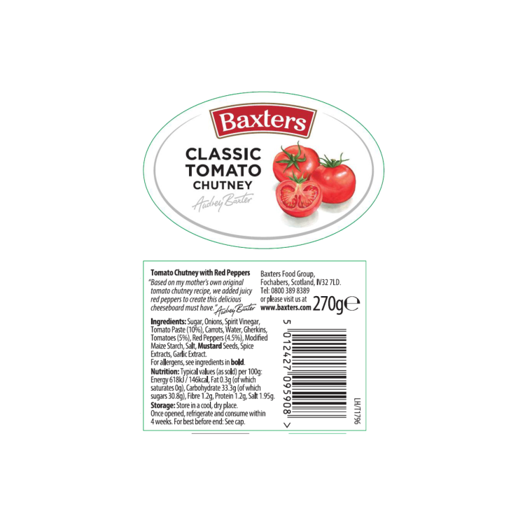 | Ingredient Declaration | Sugar,Onions,Spirit Vinegar,Tomato Paste (10%),Carrots,Water,Gherkins,Tomatoes (5%),Red Peppers (4.5%),Modified Maize Starch,Salt,Mustard Seeds ,Spice Extracts,Garlic Extract, |