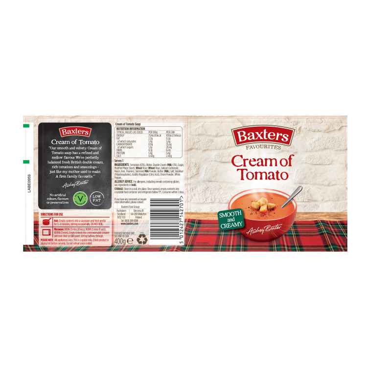 | Ingredient Declaration | Tomatoes (56%), Water, Sugar, Whole MILK, Modified Maizr Starch, WHEAT Flour: (WHEAT Flour, Calcium Carbonate, Iton, Niachin, Thiamin), Rapeseed Oil, Butter (MILK), Double Cream (MILK) 1%, Skimmed MILK Powder, Salt, Potato Starch. Acidity Regulator: Citric Acid E330, Onion Powder, White Pepper. |