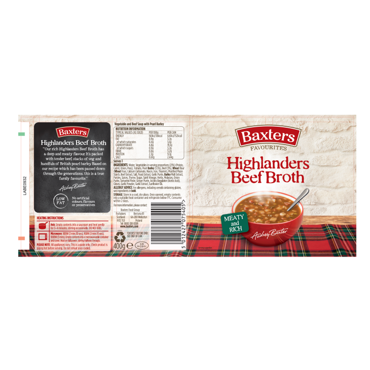 | Ingredient Declaration | Water, Potatoes, Carrots, Pearl Barley (6%), Tomatoes, Onions, Peas, Beef (1.5%), Wheat Flour: (Wheat Flour, Calcium Carbonate, Iron, Niacin, Thiamin), Mutton (1.5%), Modified Maize Starch, Salt, Yeast Extract, Worcester Sauce (Water, Sugar, Spirit Vinegar, Molasses, Onion Puree, Salt, Tamarind Paste, Ginger Puree, Acidity Regulator (Acetic Acid) Cloves, Garlic Extract) Parsley, Barley Malt Extract, Beef Extract, Thyme, Spices: (Black Pepper, Cumin, Fenugreek, Ginger, Pimento, Red Chilli Pepper, Tumeric), Ground Rosemary, Bay Leaf, Coriander, Garlic Powder, Sunfower Oil. |