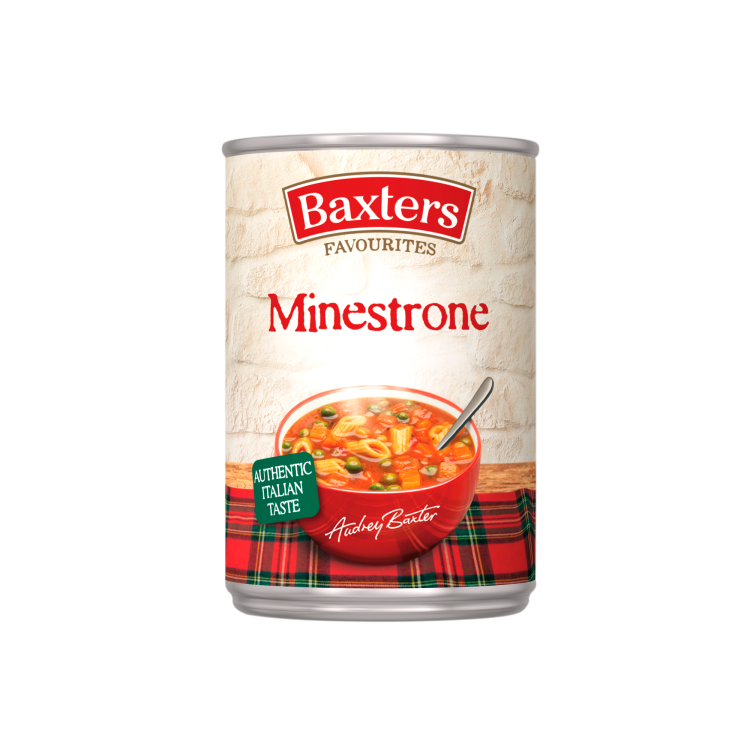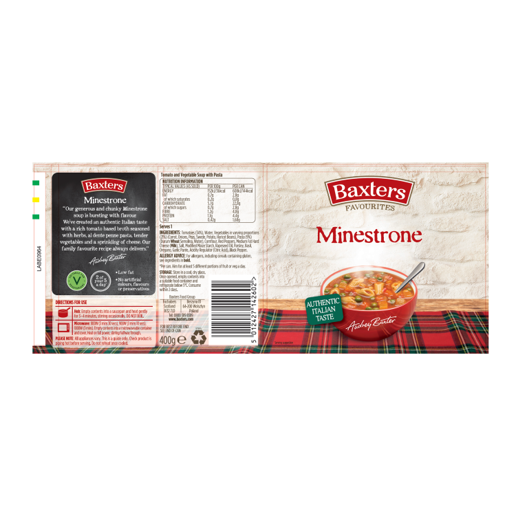 | Ingredient Declaration | Water, Tomatoes (21%), Pasta: (Durum WHEAT, Semolina, Water) 14%, Carrots, Onions Sweded, Potatoes, Peas, Haricot Beans, Cabbage, Yellow Peas, Cornflour, Red Peppers, Leeks, Salt, yeast Extract, Medium Fat Hard Cheese (MILK), Rapeseed Oil, Modified Maize Starch, Mixed Herbs: (Parsley, Basil, Oregano, Marjoram, Thyme, Sage), Garlic Puree, Flavourings, Acidity Regulator (Citric Acid)E330, Black Pepper. |