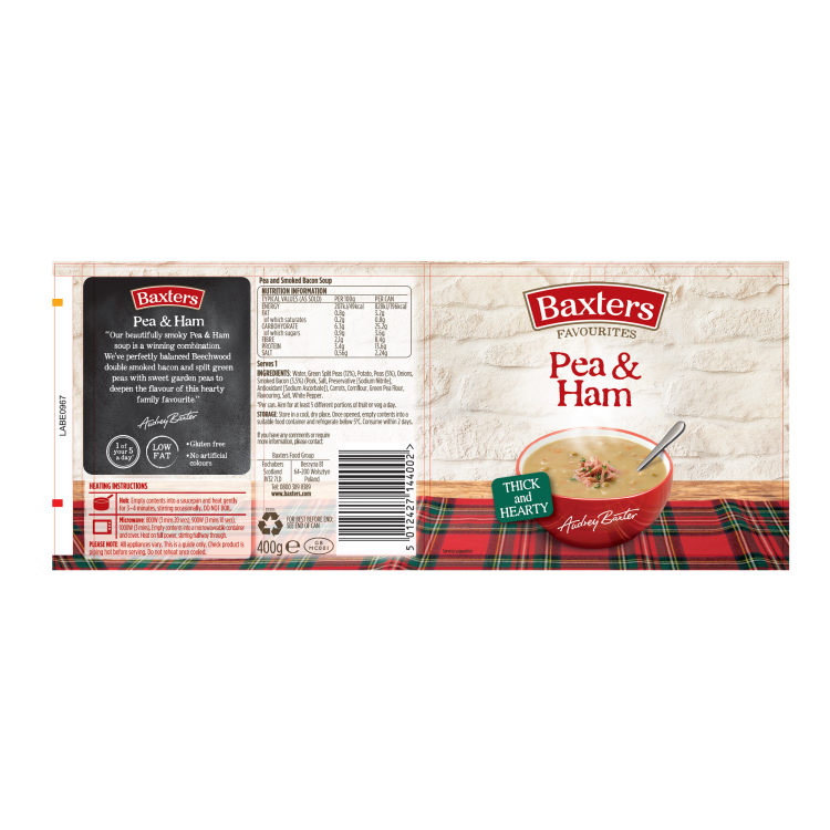 | Ingredient Declaration | Water, Green Split Peas (13%), Potatoes, Peas (5%), Onions, Smoked Bacon (3.5%) (Pork, Salt, Preservative (Sodium Nitrite) E250, Antioxidant (Sodium Ascorbate)E301, Carrots, Cornflour. Green Pea Flour, Flavouring, Salt, White Pepper. |