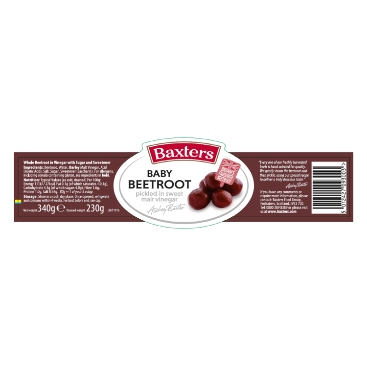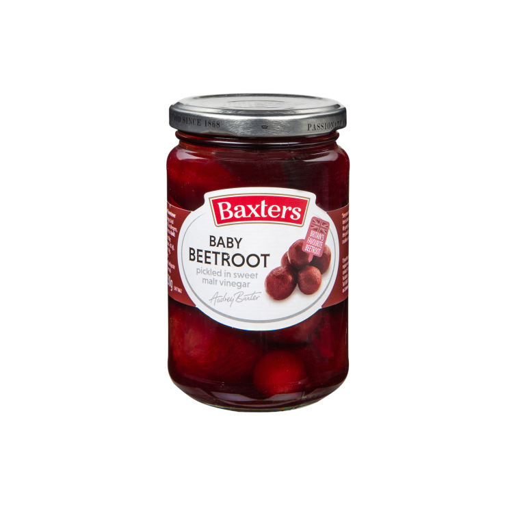 | At Baxters they pride themselves on producing the highest quality and best tasting beetroot. Their freshly harvested baby beetroot is the pick of the crop. Its gently steam cooked in small batches and then hand sorted to ensure only the best makes it into their jars. They then pickle in a traditional sweet vinegar made from 100% British barley to ensure a truly delicious taste. |