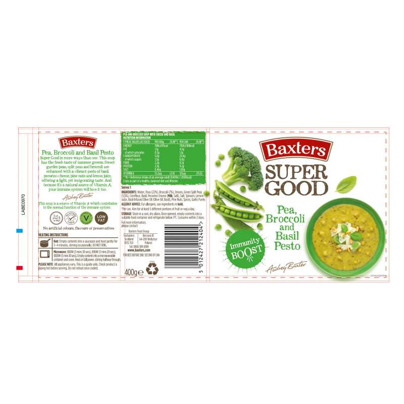 Ingredient Declaration Water,Peas 22%, Broccoli 6%, Onion, Green Split Peas 3%, Cornflour, Basil, Pecorino Cheese (Milk, Salt), Salt, Spinach, Lemon Juice, Olive Oil, Pine Nuts, Turmeric, Garlic Puree , Black Pepper