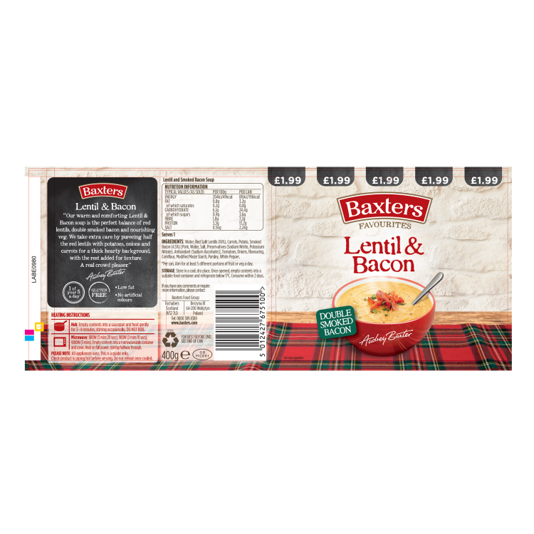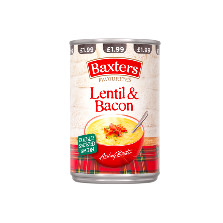 | Ingredient Declaration | Water, Red Split Lentils (16%). Carrots, Potatoes, Smoked Bacon (4.5%) [Pork, Water, Salt, Preservatives (Sodium Nitrite, Potassium Nitrate). Antioxidant (Sodium Ascorbate)]. Tomatoes, Onions, Flavouring, Cornflour, Modified Maize Starch, Parsley, White Pepper. |