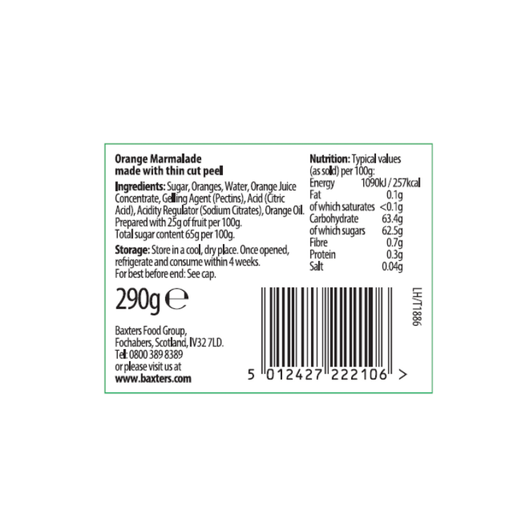 | Ingredient Declaration | Sugar,Oranges,Water,Orange Juice Concentrate,Gelling Agent (Pectins),Acid (Citric Acid),Acidity Regulator (Sodium Citrates)Orange Oil, Prepared with 25g of fruit per 100g. Total sugar content 65g per 100g. |