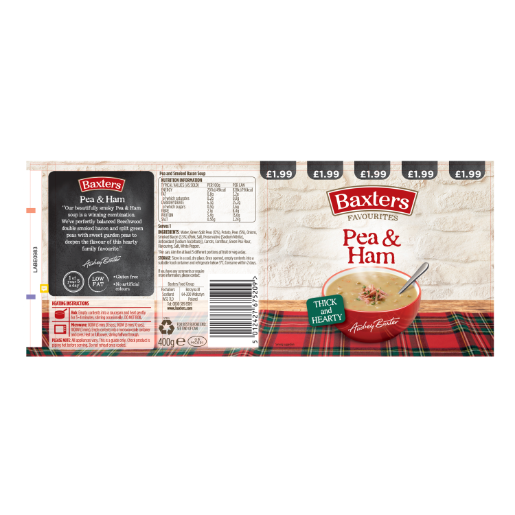 | Ingredient Declaration | Water, Green Split Peas (12%). Potatoes, Peas (5%). Onions, Smoked Bacon (3.5%) (Pork, Salt, Preservative [Sodium Nitrite]. Antioxidant [Sodium Ascorbate]). Carrots, Cornflour, Green Pea Flour, Flavouring, Salt, White Pepper. |