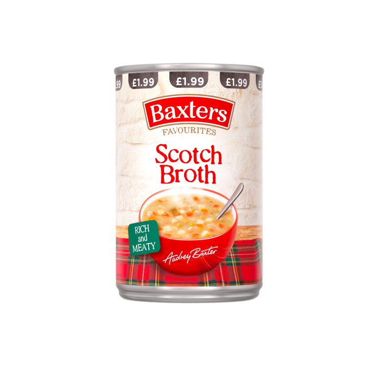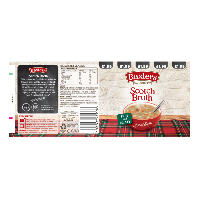| Ingredient Declaration | Water, Pearl BARLEY (6%). Carrots, Marrowfat Peas, Potatoes Onions, Swede, Mutton (2%). Beef (1.5%). Cornflour, Cabbage, Modified Maize Starch, Salt, Lamb Extract, Yeast Extract, Parsley, White Pepper, Tomato Puree, Carrot Powder, Leek Powder, Sugar, Natural Rosemary Flavouring. |
