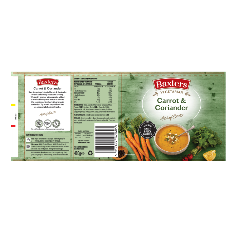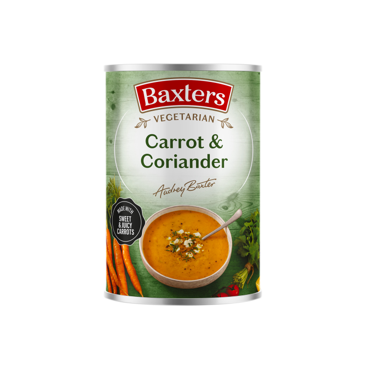 | Ingredient Declaration | Water, Carrots (26%), Onions, Tomatoes, Rapeseed Oil, Whey Powder (Milk), Modified Maize Starch, Butter (Milk), Coriander (0.5%), Yeast Extract, Ground Coriander, Salt, Stabiliser (Polyphosphates), Lemon Juice Concentrate, Black Pepper |