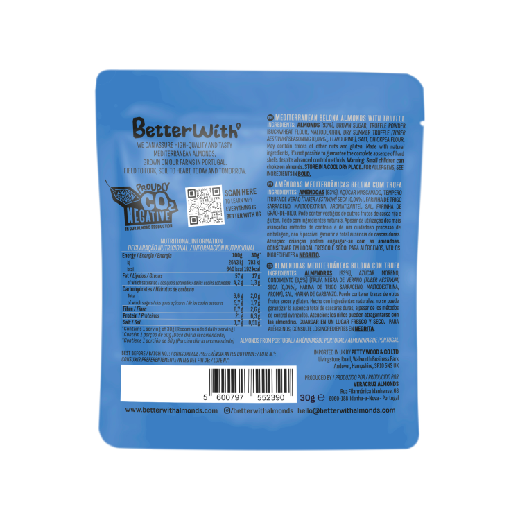 | Ingredient Declaration | Almonds (93%), truffle powder (dry summer truffle seasoning, buckwheat flour, maltodextrin, flavouring) (3,5%), brown sugar (2,55%), salt (0,85%) and chickpea flour (0,1%) |