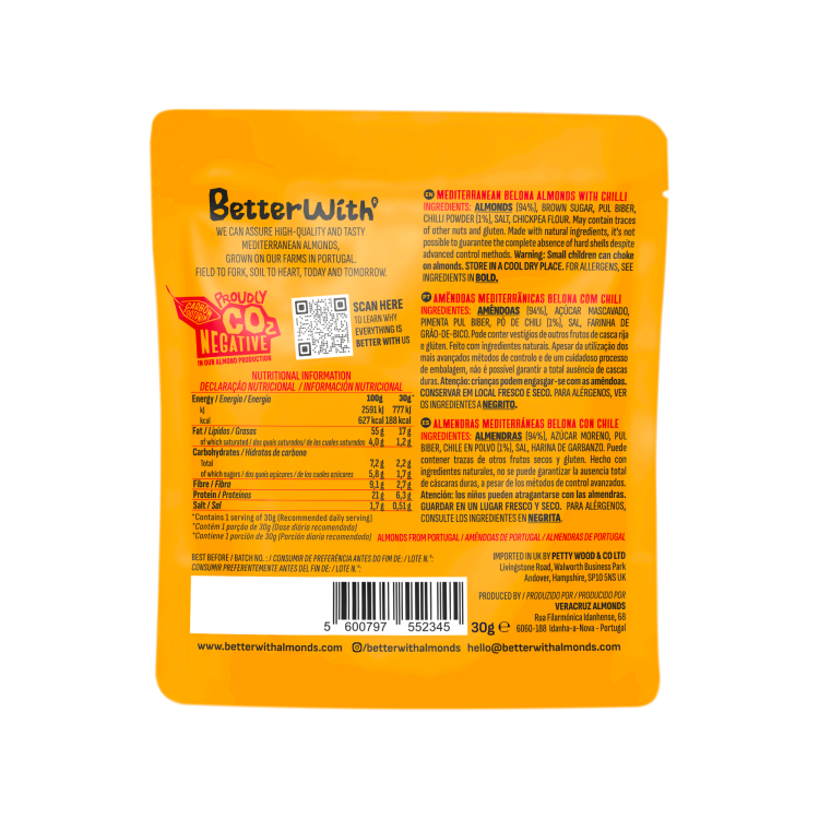 | Ingredient Declaration | Almonds (93,5%), brown sugar (2,55%), pul biber (2%), chili powder (1%), salt (0,85%) and Chickpea flour (0,1%) |