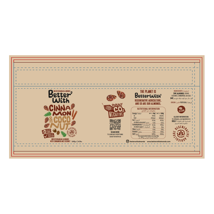 | Ingredient Declaration | Almonds (76%), sugar (14,5%), coconut (5%), cinnamon (3,5%) and sea salt (1%) |
