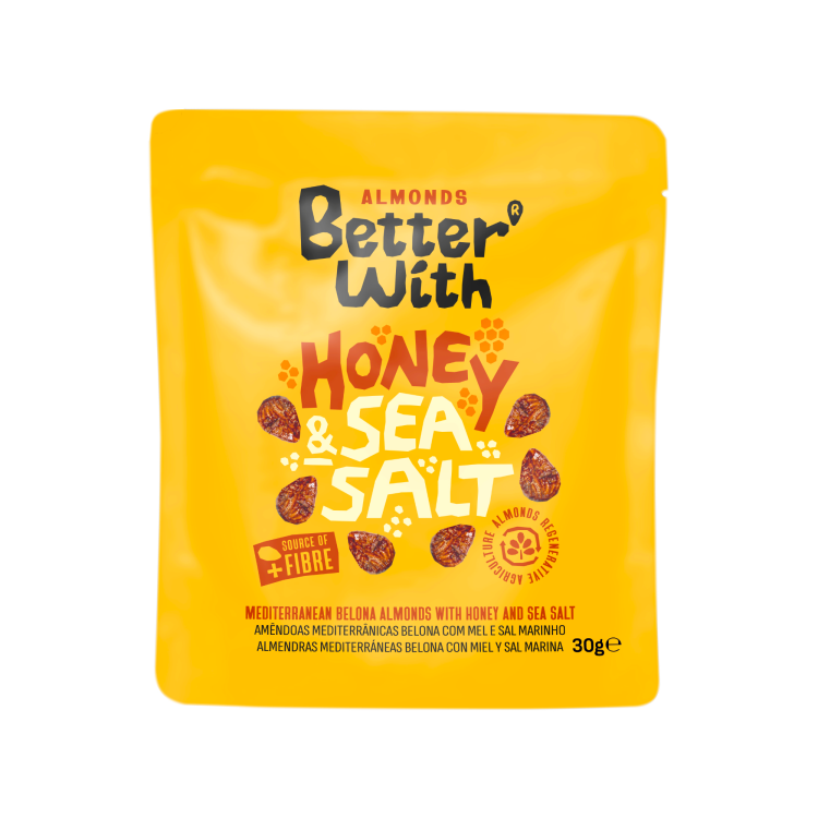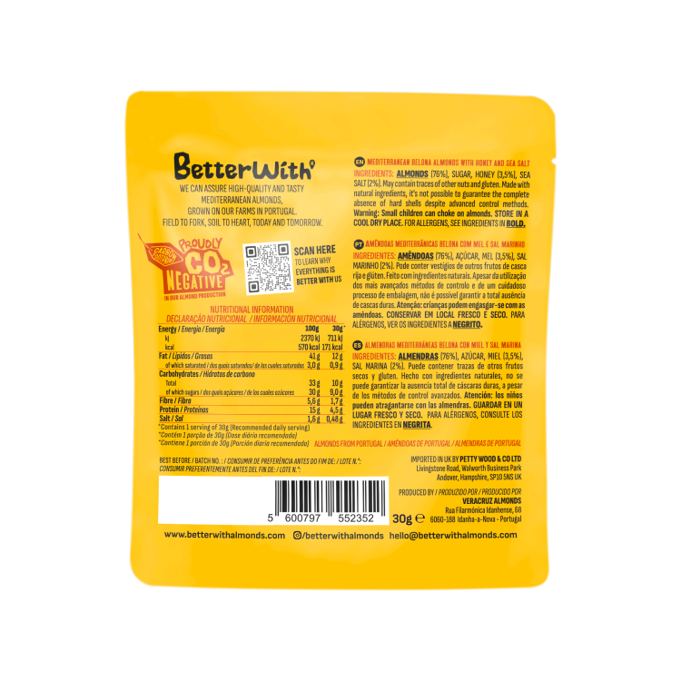 | Ingredient Declaration | Almonds (76%), sugar (18,5%), honey (3,5%) and salt (2%) |