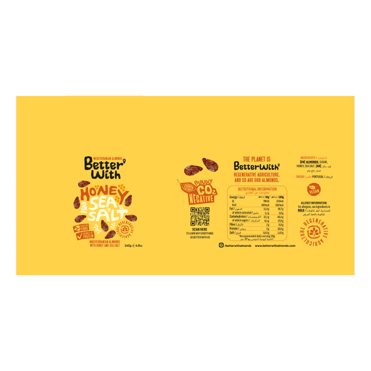 | Ingredient Declaration | Almonds (76%), sugar (18,5%), honey (3,5%) and salt (2%) |