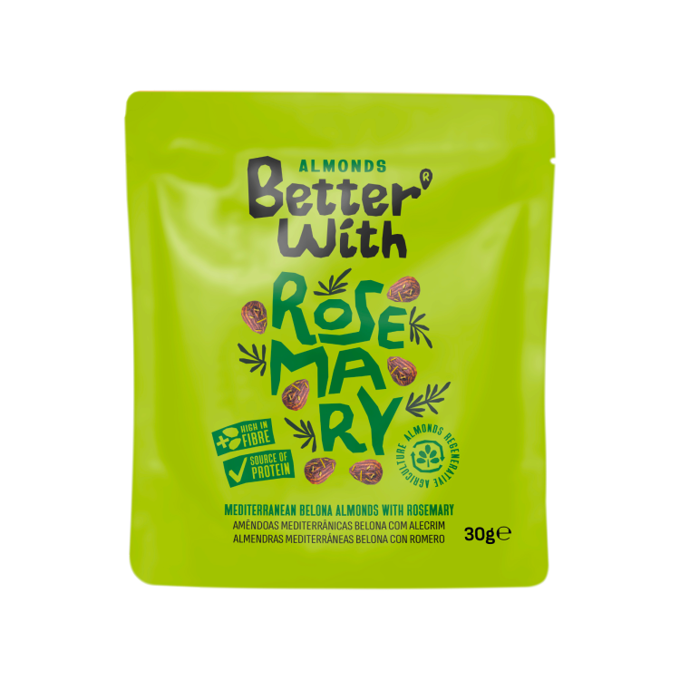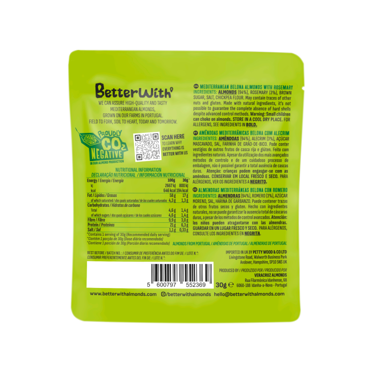 | Ingredient Declaration | Almonds (93,5%), rosemary (3%), brown sugar (2,55%), salt (0,85%) and chickpea flour (0,1%) |