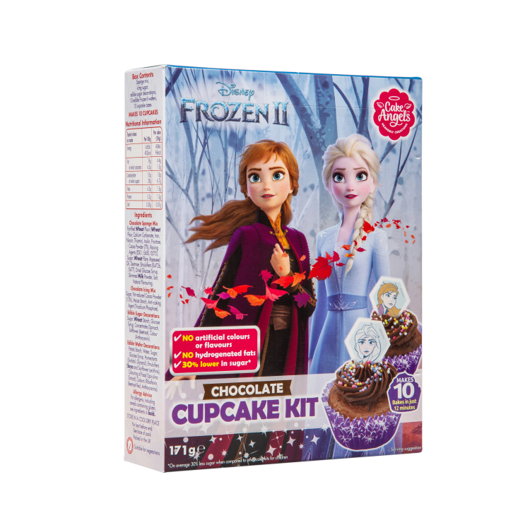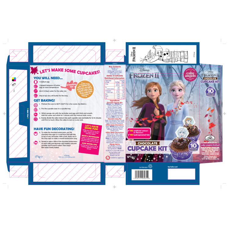 Ingredient Declaration Chocolate Sponge Mix: Wheat Flour (Wheat Flour, Calcium Carbonate, Iron, Niacin, Thiamin),Sugar, Fat-reduced Cocoa Powder (7%), Raising Agents (E501, E450, E575), Rapeseed Oil, Dextrose, Emulsifiers (E472b, E477), Dried Glucose Syrup, Skimmed Milk Powder, Salt.Chocolate Icing Mix: Sugar, Fat-reduced Cocoa Powder (10%), Maize Starch, Anti-caking Agent (Tricalcium Phosphate).Edible Sugar Decorations: Sugar, Wheat Starch, Glucose Syrup, Concentrates (Spinach, Safflower, Beetroot), Colour (Anthocyanin).Edible Wafer Decorations: Potato Starch, Water, Sugar, Glucose Syrup, Humectants, (Sorbitol, Glycerol), Emulsifiers (Soya and Sunflower Lecithins), Natural Food Colours (Spirulina Extract, Riboflavin, Beetroot Red, Anthocyanins).