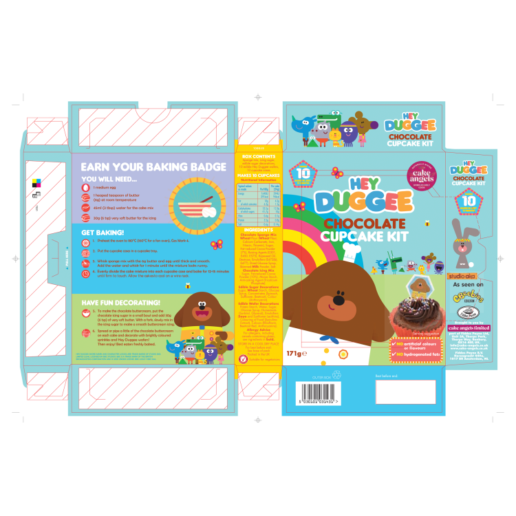 Chocolate Sponge Mix: Wheat Flour (Wheat Flour, Calcium Carbonate, Iron, Niacin, Thiamin),Sugar, Fat-reduced Cocoa Powder (7%), Raising Agents (E501, E450, E575), Rapeseed Oil, Dextrose, Emulsifiers (E472b, E477), Dried Glucose Syrup, Skimmed Milk Powder, Salt.Chocolate Icing Mix: Sugar, Fat-reduced Cocoa Powder (10%), Maize Starch, Anti-caking Agent (Tricalcium Phosphate).Edible Sugar Decorations: Sugar, Wheat Starch, Glucose Syrup, Concentrates (Spinach, Safflower, Beetroot), Colour (Anthocyanin).Edible Wafer Decorations: Potato Starch, Water, Sugar, Glucose Syrup, Humectants, (Sorbitol, Glycerol), Emulsifiers (Soya and Sunflower Lecithins), Natural Food Colours (Spirulina Extract, Riboflavin, Beetroot Red, Anthocyanins). |