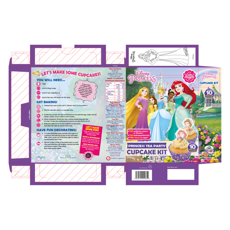 Plain Sponge Mix: Wheat Flour (Wheat Flour, Calcium Carbonate, Iron, Niacin, Thiamin), Sugar, Raising Agents (E501, E450, E575), Rapeseed Oil, Dextrose, Emulsifiers (E472b, E477), Dried, Glucose Syrup, Skimmed Milk Powder, Salt.Icing Mix: Sugar, Maize Starch, Anti-caking Agent (Tricalcium Phosphate).Edible Sugar Decorations: Sugar, Wheat Starch, Glucose Syrup, Concentrates (Spinach, Safflower, Beetroot), Colour (Anthocyanin).Edible Wafer Decorations: Potato Starch, Water, Sugar, Glucose Syrup, Humectants (Sorbitol, Glycerol), Emulsifiers (Soya and Sunflower Lecithins), Natural Food colours (Spirulina Extract, Riboflavin, Beetroot Red, Anthocyanins). |