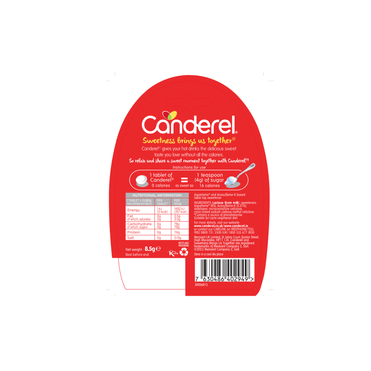 | Ingredient Declaration | LACTOSE (MILK) Sweetener (Aspartame)* 8%Acesulfame-K 5.37% Stabilisers Microcrystalline cellulose Cross linked sodium carboxy methyl cellulose |
