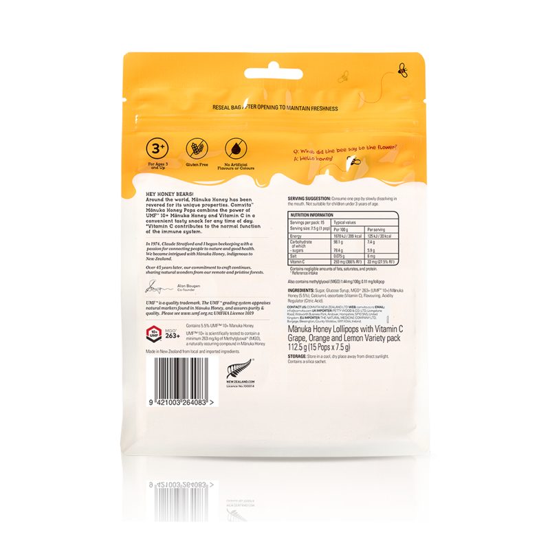 | Ingredient Declaration | Suger/Glucose Syrup/MGO 263+ (UMF 10+) Manuka Honey, Calcium-L-ascorbate (vitamin c) Flavouring Acidity Regulator (Citric Acid) |