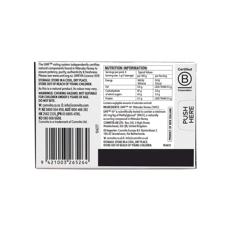 | Ingredient Declaration | Pure New Zealand Manuka Honey (UMF® 10+) |