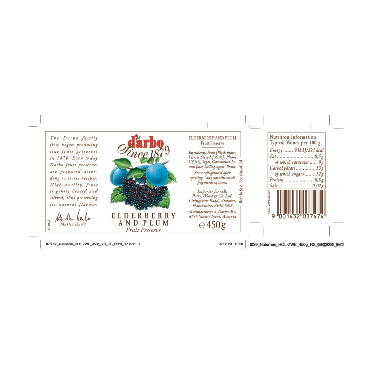 | Ingredient Declaration | Fruit (35% black elderberries, 15% plums)sugarconcentrated lemon juicegelling agent: pectin |