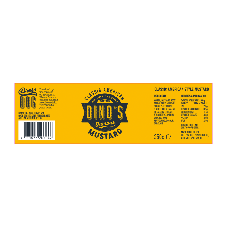 | Ingredient Declaration | Water, MUSTARD seeds (11%) (EU & Non-EU),Spirit Vinegar, Sugar, Salt, Maize Starch, Preservative: Potassium Sorbate, Stabilizer: Xanthan Gum, Natural Flavouring, Colour: Curcumin. |