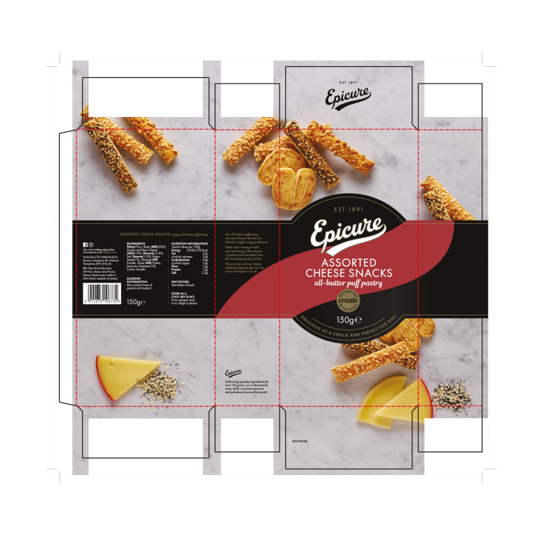 | Ingredient Declaration | WHEAT Flour, Butter 30% (MILK). Gouda and Edam Cheese 10% (MILK). ALMONDS (2.3%). Salt, SESAME (1.3%). Poppy Seeds (1%). Skimmed MILK Powder, Glaze (MILK protein, Dextrose, Rapeseed Oil). |