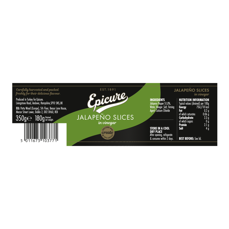 | Ingredient Declaration | Jalapeno Pepper 51,0% Water 41,3% Vinegar 5,6% Salt 1,8% (E509) 0,3% |