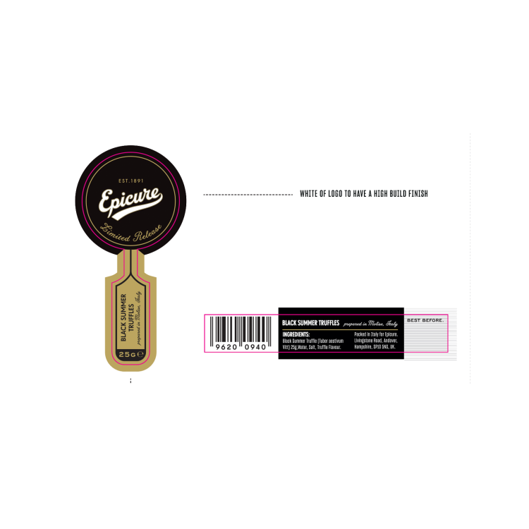 | Ingredient Declaration | Black truffle Tuber Aestivum Vittadini 100% 25g, water, salt, Truffle flavour |
