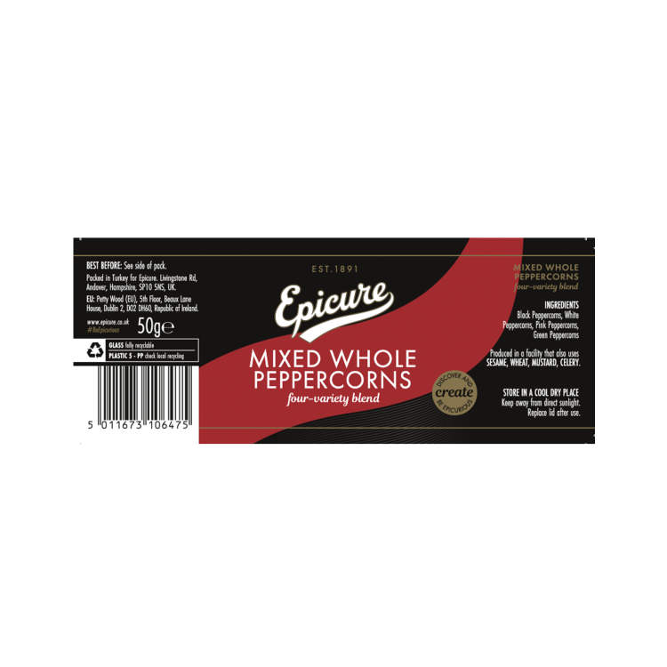 | Ingredient Declaration | 74% Black Peppercorns19% White Peppercorns5% Pink Peppercorns2% Green Peppercorns |