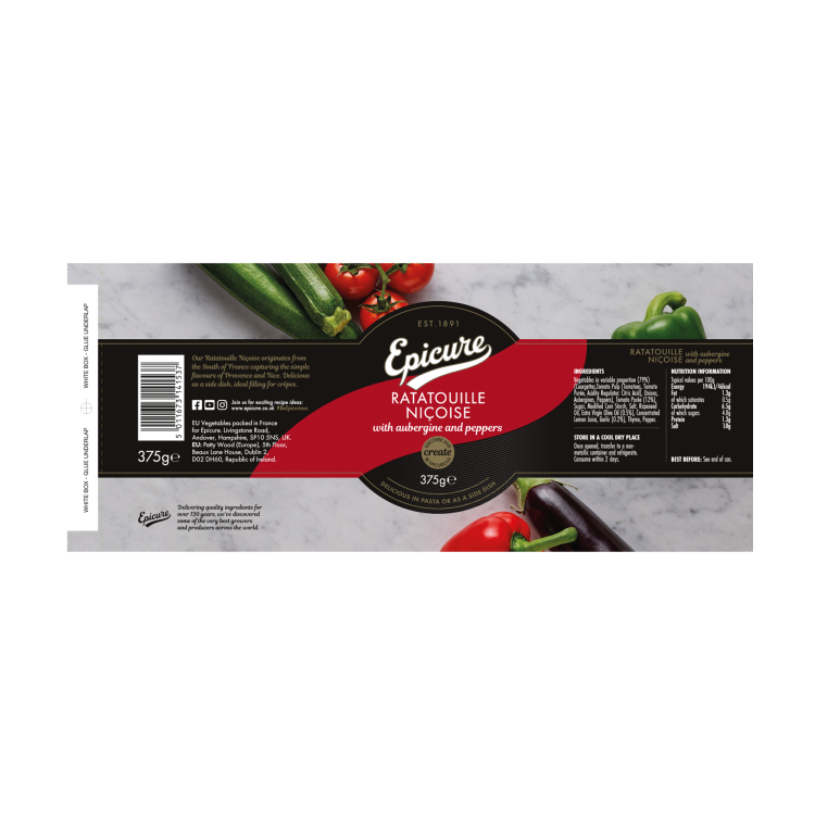 | Ingredient Declaration | Courgettes 35%, Chopped Tomatoes 30% (acidity corrector: citricacid.), Tomato Puree 14.995%, Onions 8%, Aubergines 3%, Peppers 3%, Sugar 1.55%, Modified Maize Starch 1.3%, Salt 1.05%, Oil rapeseed 1%, Virgin Olive Oil 0.5%, Concentrated Lemon Juice 0.35%*, Garlic 0.2%, Thyme 0.035%, Pepper 0.02%.*The quantity of lemon juice may vary depending on the pH. |
