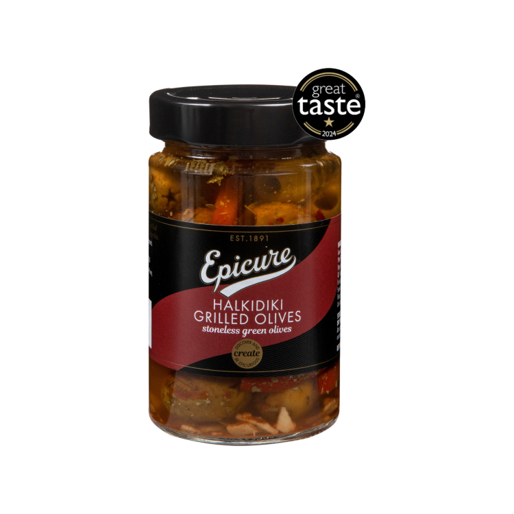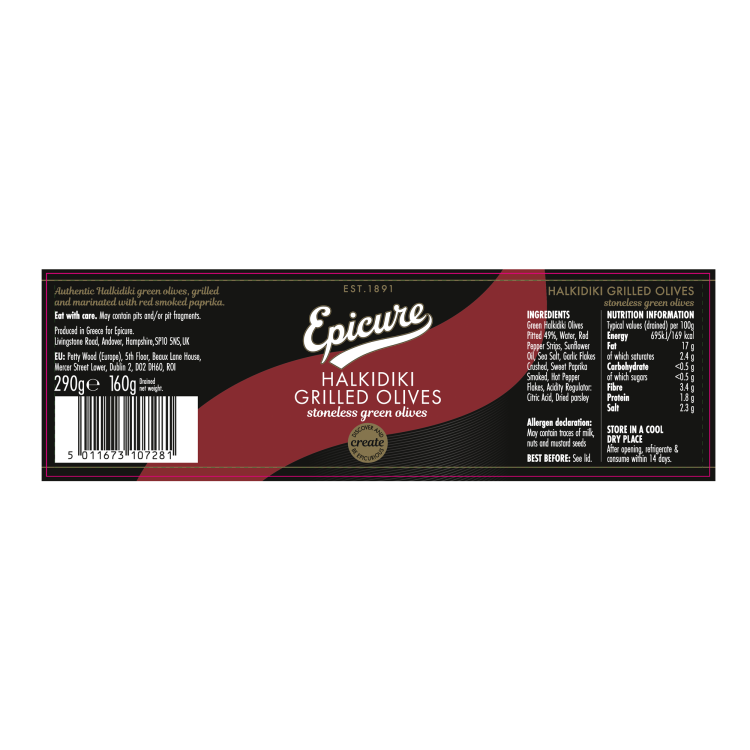 | Ingredient Declaration | Green Halkidiki olives pitted (49.32%), Water, Red pepper strips (4.91%), Sunflower oil, Sea salt, Garlic flakes crushed , Sweet paprika smoked (0.22%), Hot pepper flakes (0.13%), Acidity regulator: citric acid, dried Parsley |