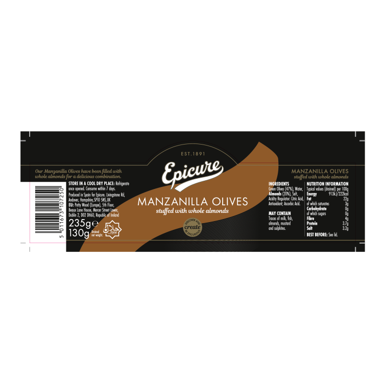 | Ingredient Declaration | Green olives 47%, water, almond 20%, salt, acidity regulator: citric acid, antioxidant; ascorbic acid. |