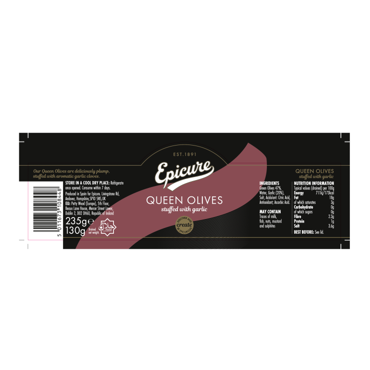 | Ingredient Declaration | Green olives 47%, water, garlic 20%, salt, acidulant: citric acid, antioxidant; ascorbic acid. |