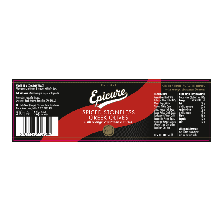 | Ingredient Declaration | Mixed Olives pitted (Green 30% & Kalamata 14.3%) 44.3% , water, sugar, white vinegar, pickled carrot strips, orange peel, sweet pepper flakes 0.6%, cumin seeds 0.4%, sunflower oil, whole chilli pepper 0.2%, hot pepper flakes 0.2%, cinnamon powder 0.1%, allspice powder 0.1%, sea salt, acidity regulator: citric acid. |