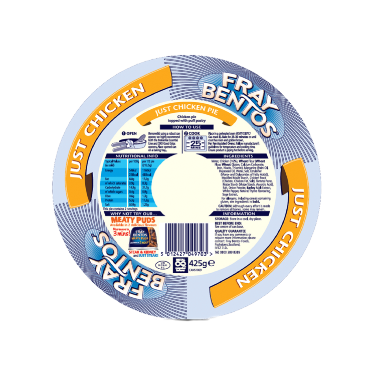 | Ingredient Declaration | Water, Chicken (21%), Wheat Flour (Wheat Flour, Wheat Gluten, Calcium Carbonate, Niacin, Iron, Thiamin), Palm Oil, Modified Maize Starch, Rapeseed Oil, Salt, Chicken Stock (Water, Chicken, Chicken Fat, Salt), Tomato Paste, Maize Starch, Onion Powder, Barley Malt Extract, White Pepper, Emulsifier (Mono- and Diglycerides of Fatty Acids), Sage, Flavouring. |