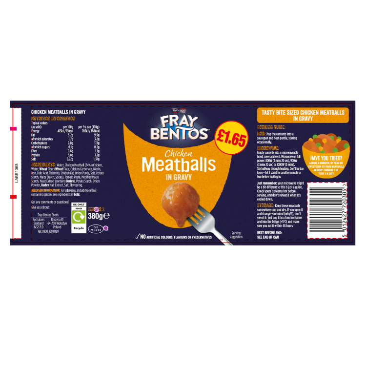 Ingredient Declaration Water, Chicken Meatball (34%) (Chicken, Water, Wheat Flour (Wheat Flour, Calcium Carbonate, Niacin, Iron, Folic Acid, Thiamin), Chicken Fat, Onion Purée, Salt, Potato Starch, Maize Starch, Spices), Tomato Paste, Modified Maize Starch, Yeast Extract (contains Barley), Potato Starch, Onion Powder, Barley Malt extract, Salt, Flavouring.ALLERGY ADVICE: For allergens, including cereals containing gluten, see ingredients in bold.