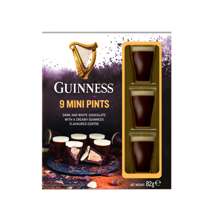 | Ingredient Declaration | INGREDIENTS: Sugar, Cocoa Mass, Cocoa Butter, Dried Whole MILK, Vegetable Oils (Palm, Rapeseed, Sunflower), Glucose Syrup, Water, Dried Skimmed MILK, Flavourings, Dextrose, GUINNESS? Beer (0.5%) (contains BARLEY and GLUTEN), Humectant (Sorbitol Syrup), Neutral Spirit, Emulsifier (SOYA Lecithin), Preservative (Sorbic Acid), BARLEY Malt Extract. White Chocolate contains Milk Solids 22% minimum. Dark Chocolate contains Cocoa Solids 52% minimum. |