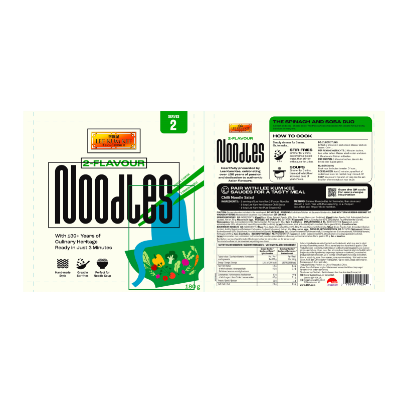 | Ingredient Declaration | Spinach Noodles: WHEAT Flour 65%, Water, Spinach Powder 10%, Ethyl Alcohol, Humectant (Sorbitols), WHEAT Gluten Powder, Salt, Antioxidant (Sodium Lactate).Buckwheat Noodles: WHEAT Flour 65%, Water, Buckwheat Flour 10%, Ethyl Alcohol, Humectant (Sorbitols), WHEAT Gluten Powder, Salt, Antioxidant (Sodium Lactate), Acidity Regulators (Potassium Carbonates, Sodium Carbonates).May contain eggs. |