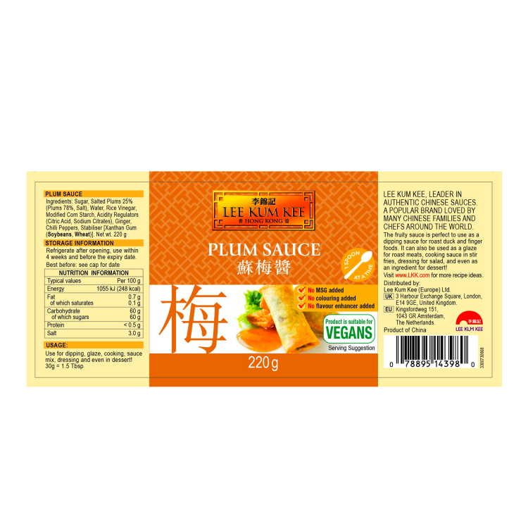 | Ingredient Declaration | Sugar, Salted Plums 25% (Plums 78%, Salt), Water, Rice Vinegar, Modified Corn Starch, Acidity Regulators (Citric Acid, Sodium Citrates), Ginger, Chilli Peppers, Stabilizer [Xanthan Gum (SOYBEANS, WHEAT)]. |