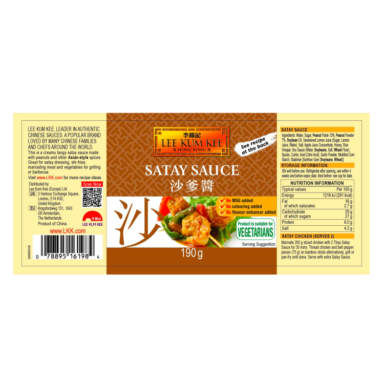 | Ingredient Declaration | Water, Sugar, PEANUT Paste 12%, PEANUT Powder 7%, SOYBEAN Oil, Sweetened Lemon Juice (Sugar, Lemon Juice, Water), Salt, Apple Juice Concentrate, Honey, Rice Vinegar, Soy Sauce (Water, SOYBEANS, Salt,WHEAT Flour), Spices, Cumin, Acid (Citric Acid), Garlic Powder, Modified Corn Starch, Stabiliser [Xanthan Gum (SOYBEANS, WHEAT)]. |