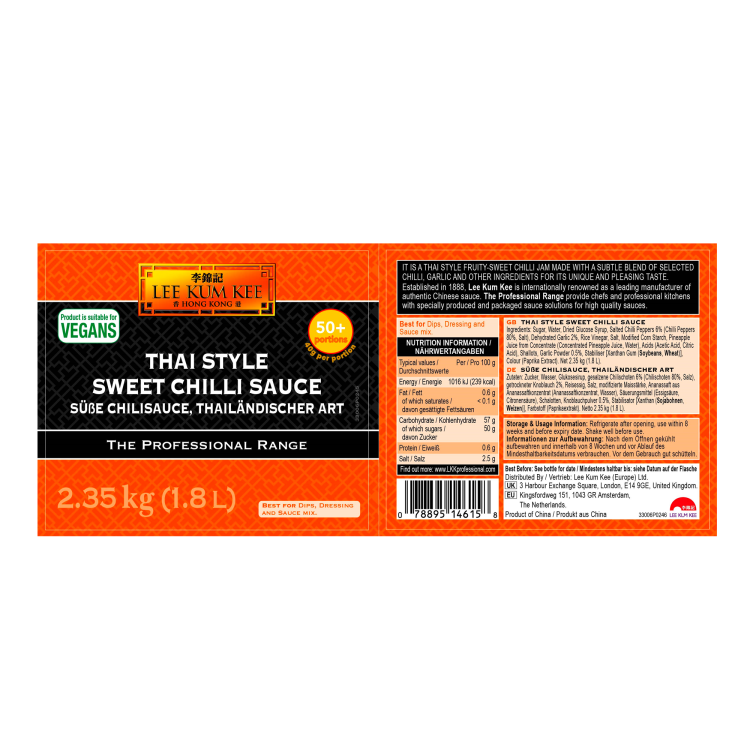 | Ingredient Declaration | Sugar, Water, Dried Glucose Syrup, Salted Chilli Peppers 6% (Chilli Peppers 80%, Salt), Dehydrated Garlic 2%, Rice Vinegar, Salt, Modified Corn Starch, Pineapple Juice Concentrate (Concentrated Pineapple Juice, Water), Acids (Acetic Acid, Citric Acid), Shallots, Garlic Powder 0.5%, Stabilizer [Xanthan Gum (SOYBEANS, WHEAT), Colour (Paprika Extract). |