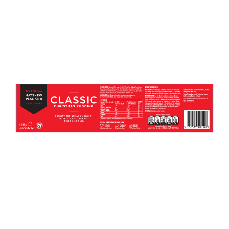 | Ingredient Declaration | Sultanas (28%), Sugar, Fortified Wheat Flour (WHEAT Flour, Calcium Carbonate, Iron, Niacin, Thiamin), Cider (9%), Water, Humectant: Glycerine, Palm Oil, Candied Mixed Peel (Orange Peel, Glucose-Fructose Syrup, Lemon Peel, Sugar, Acidity Regulator: Citric Acid), Rum (1%), Mixed Spice, Salt, Molasses, Yeast. |