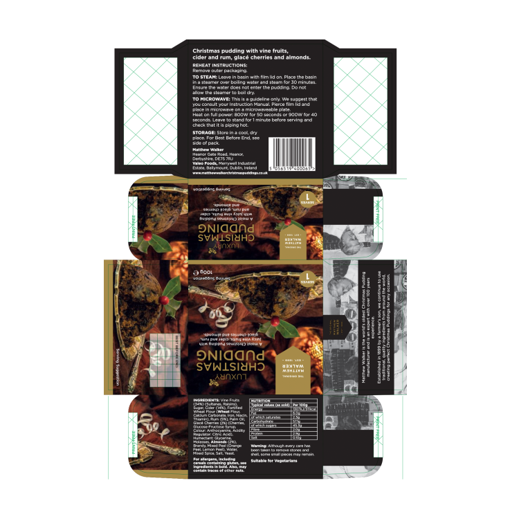 | Ingredient Declaration | Vine Fruits (34%) (Sultanas, Raisins), Sugar, Cider (14%), Fortified Wheat Flour (WHEAT Flour, Calcium Carbonate, Iron, Niacin, Thiamin), Rum (5%), Palm Oil, Glace Cherries (2%) (Cherries, Glucose-Fructose Syrup, Colour: Anthocyanins, Acidity Regulator: Citric Acid), Humectant: Glycerine, Molasses, ALMONDS (2%), Brandy, Mixed Peel (Orange Peel, Lemon Peel), Water, Mixed Spice, Salt, Yeast. |