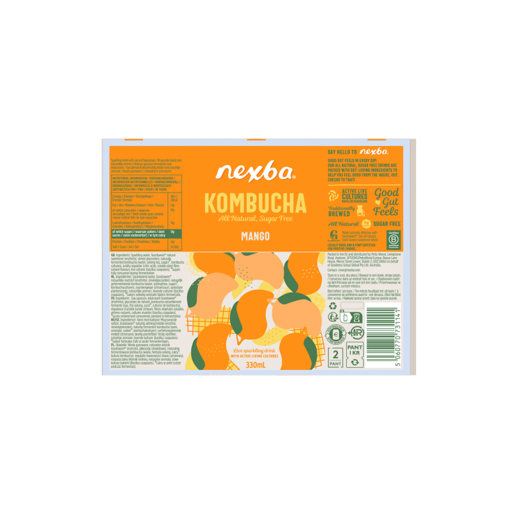 | Ingredient Declaration | Carbonated water; naturally fermented kombucha (purified water, oolong tea,sugar, kombucha cultures), natural sweeteners (erythritol, steviol glycosides);acidity regulator (citric acid); natural flavour (mango), live cultures (Bacilluscoagulans). |